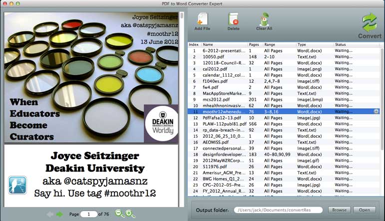 After setting the output settings, click Convert button to convert PDF to Word. The conversion will be finished in seconds. Then you can click on the link in the document list to open the converted word doc or click on the File-‐>Open Output Folder to open the converted output folder.